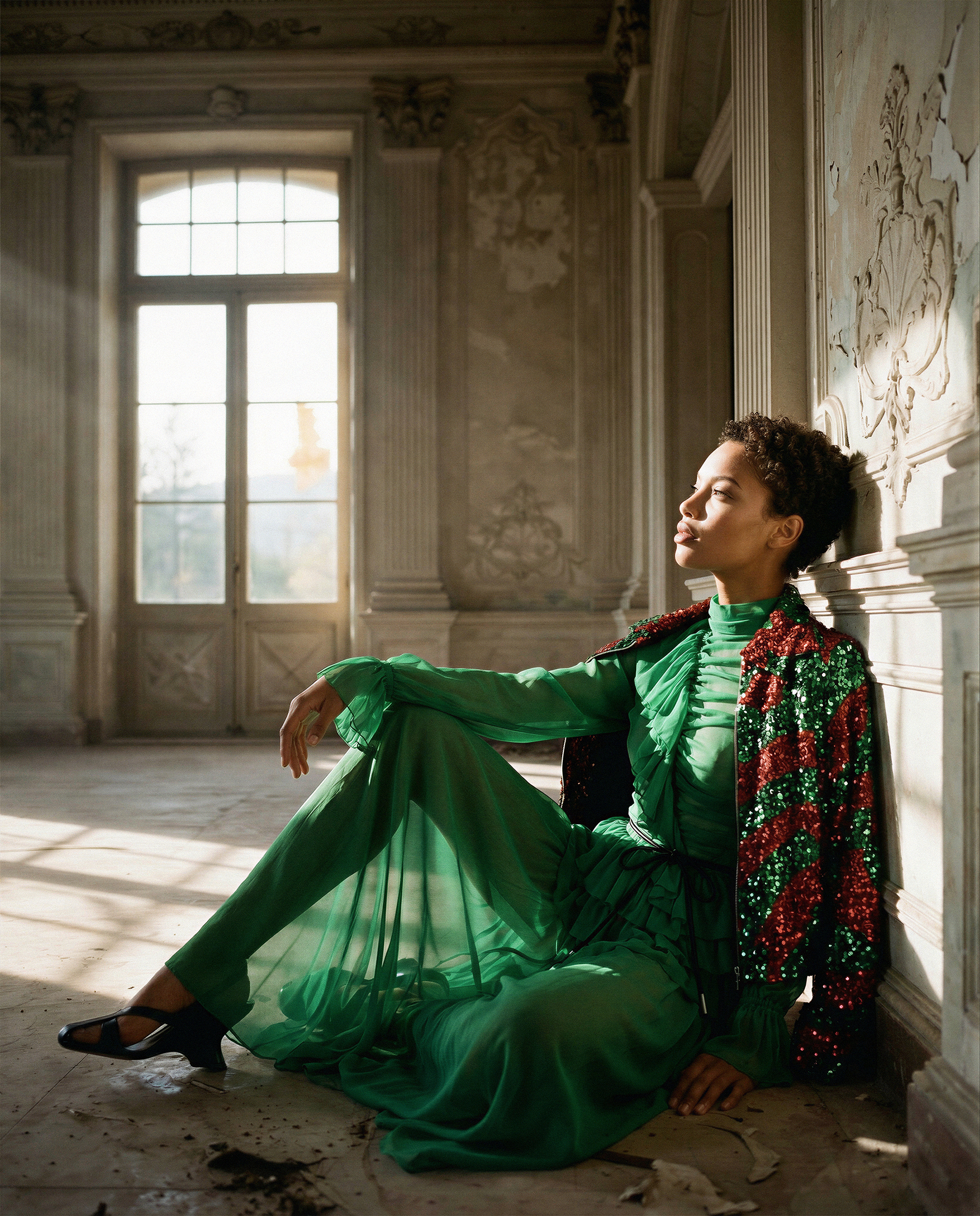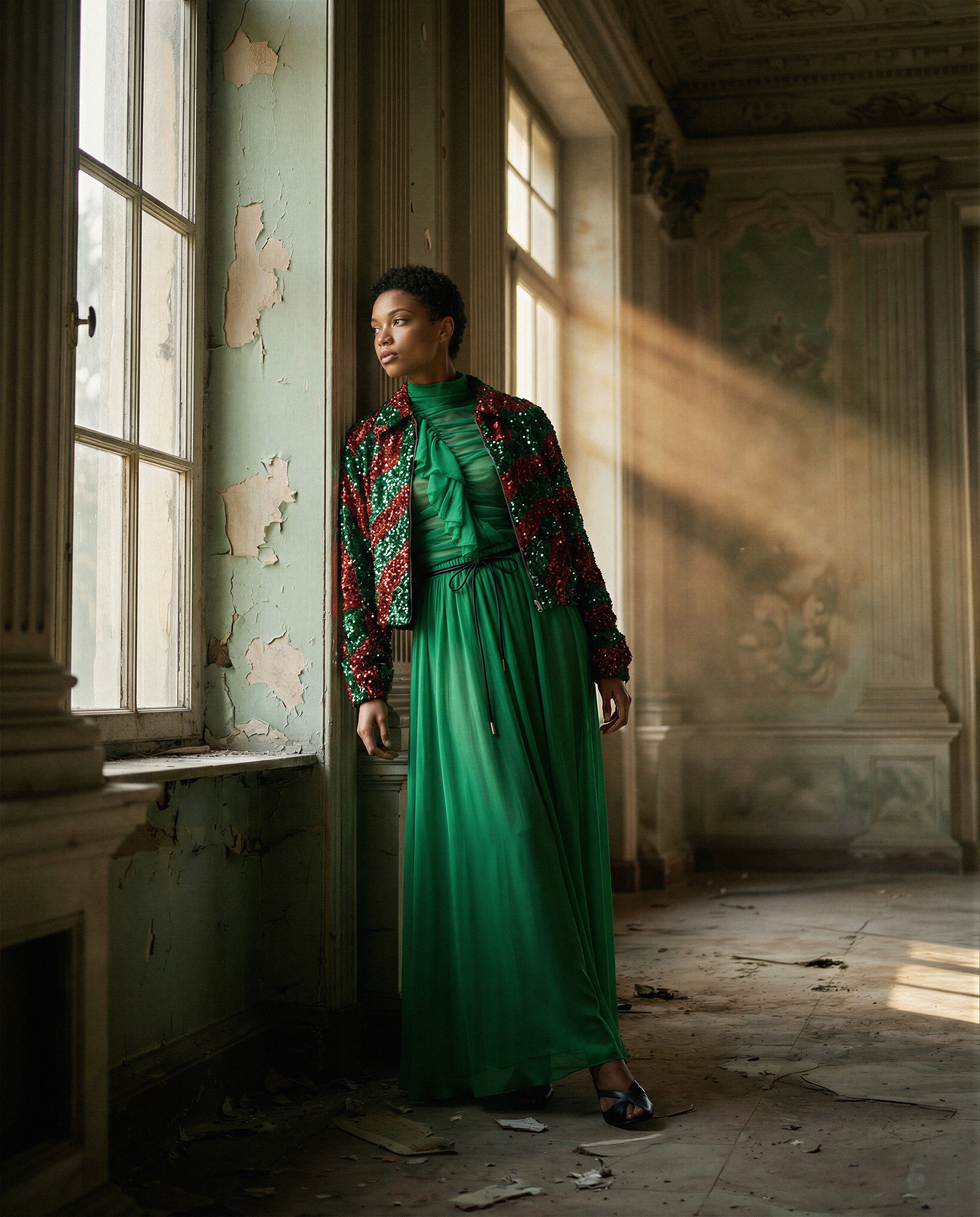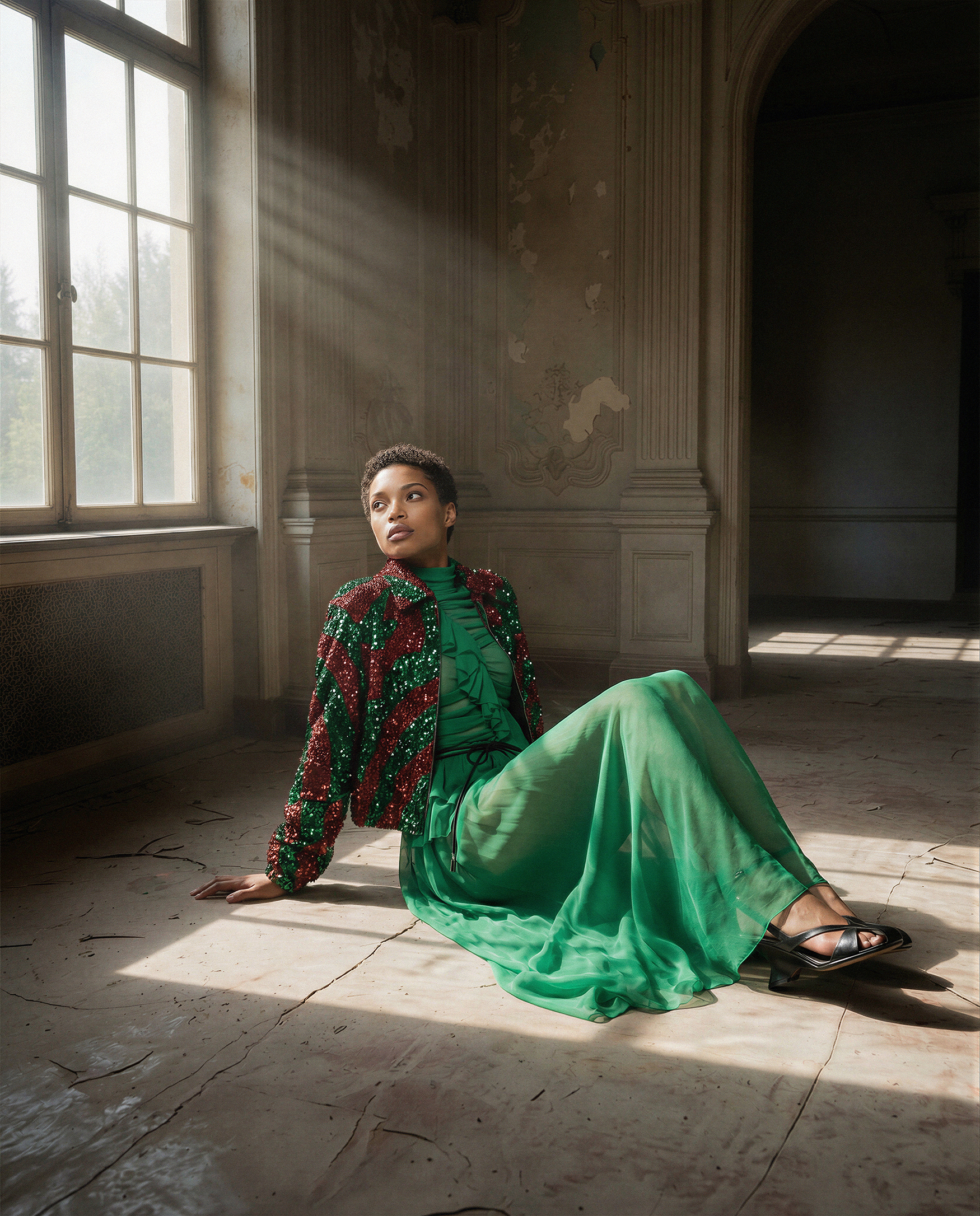 The direction is built around controlled natural light and spatial stillness. Sunlight entering through tall windows defines structure, casting measured shadows that articulate the garments and the architectural decay. Sequined emerald surfaces and layered chiffon act as calibrated focal points against muted plaster walls and cracked ceilings. Figures are placed with deliberate distance, allowing the environment to shape posture, rhythm, and scale. Materials respond to light rather than overpower it, creating a quiet tension between fragility and authority. The space operates as an active compositional force, transforming interior architecture into a framework that stabilizes color, texture, and silhouette within a cohesive fashion narrative.