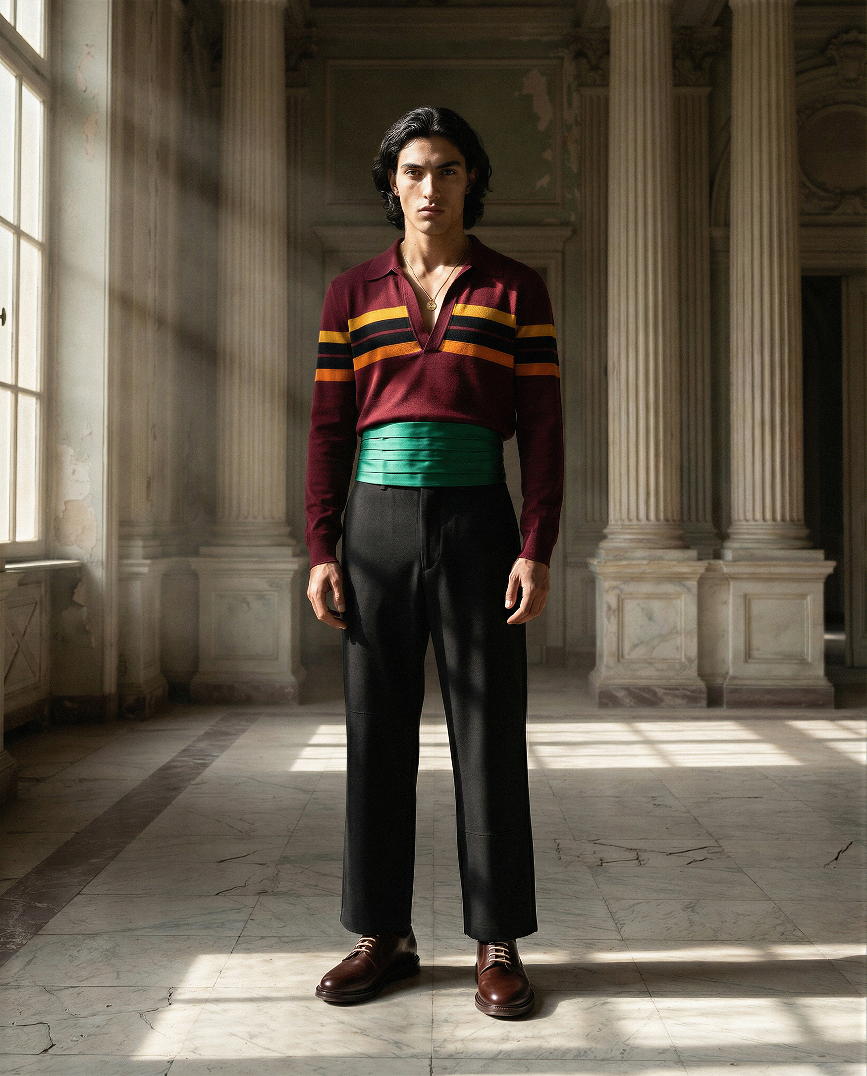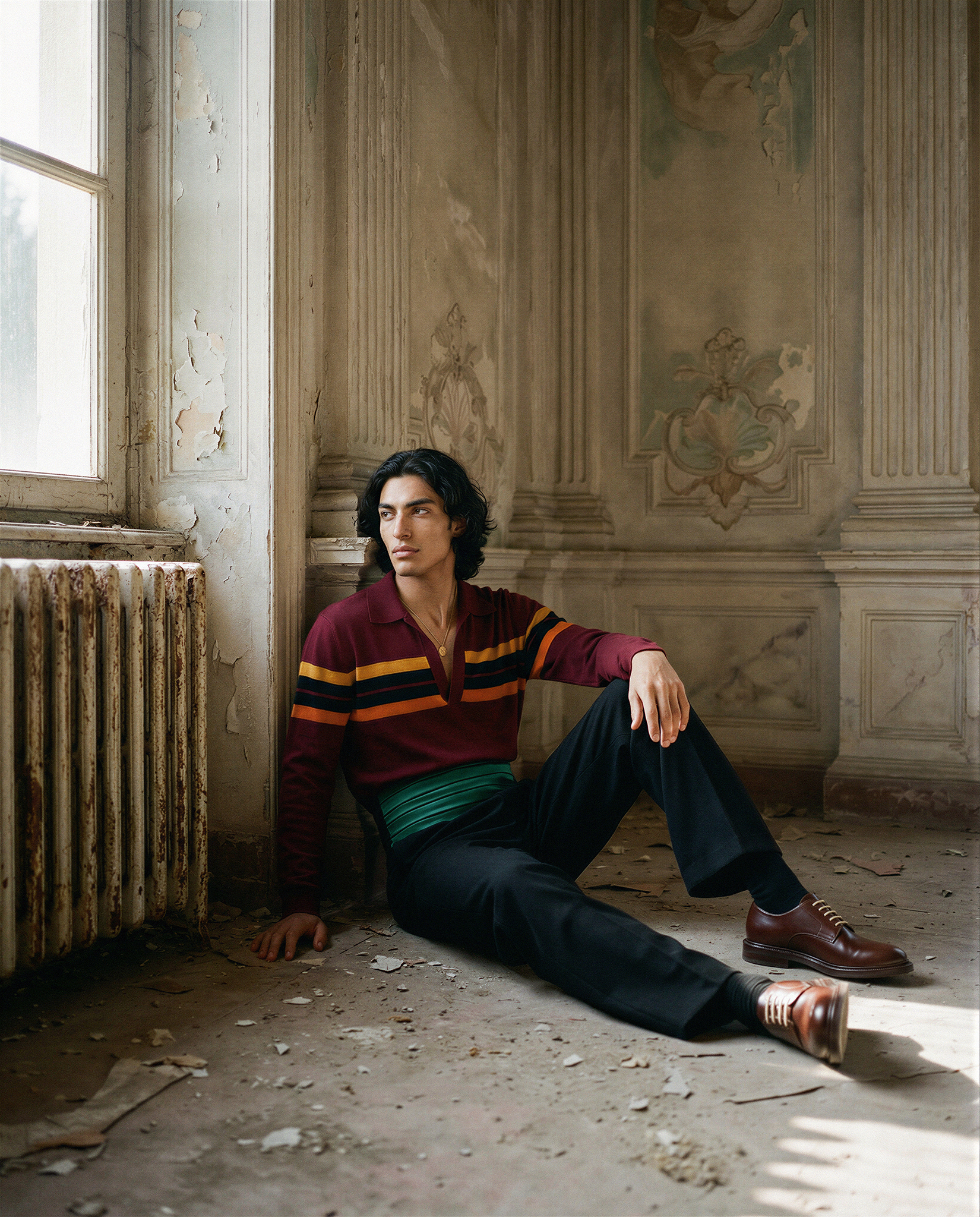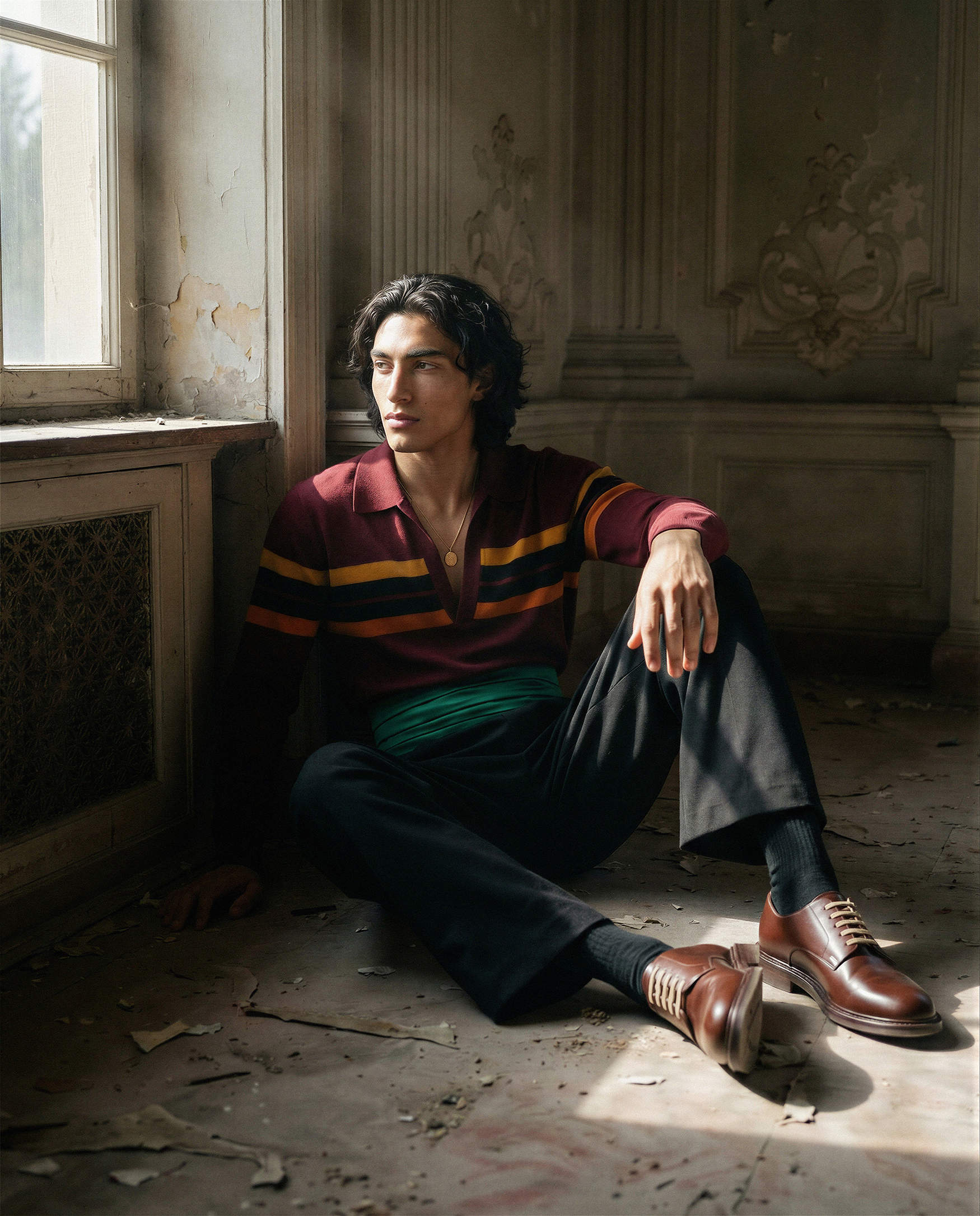 The direction is built around controlled natural light and spatial stillness. Sunlight entering through tall windows defines structure, casting measured shadows that articulate the garments and the architectural decay. Sequined emerald surfaces and layered chiffon act as calibrated focal points against muted plaster walls and cracked ceilings. Figures are placed with deliberate distance, allowing the environment to shape posture, rhythm, and scale. Materials respond to light rather than overpower it, creating a quiet tension between fragility and authority. The space operates as an active compositional force, transforming interior architecture into a framework that stabilizes color, texture, and silhouette within a cohesive fashion narrative.