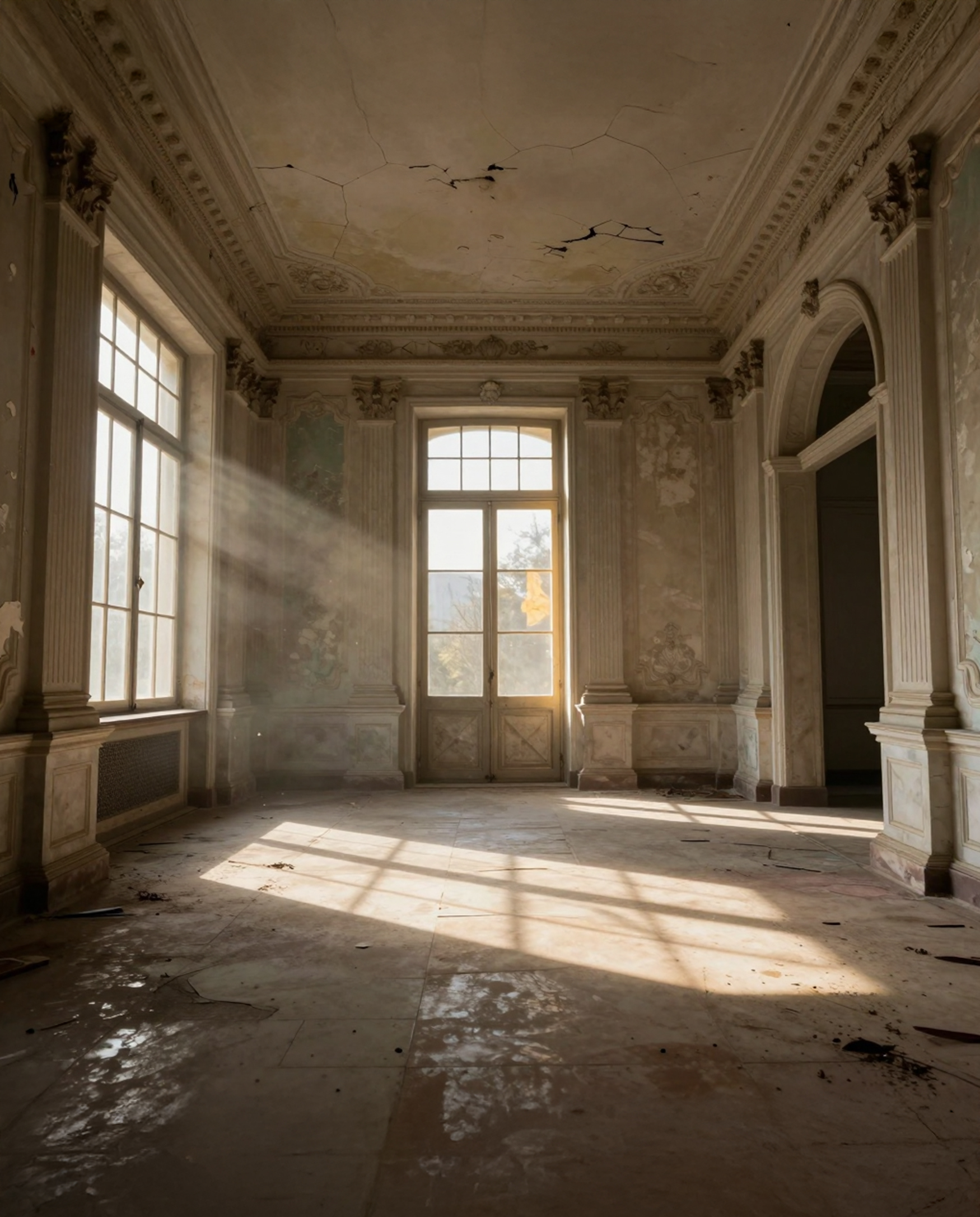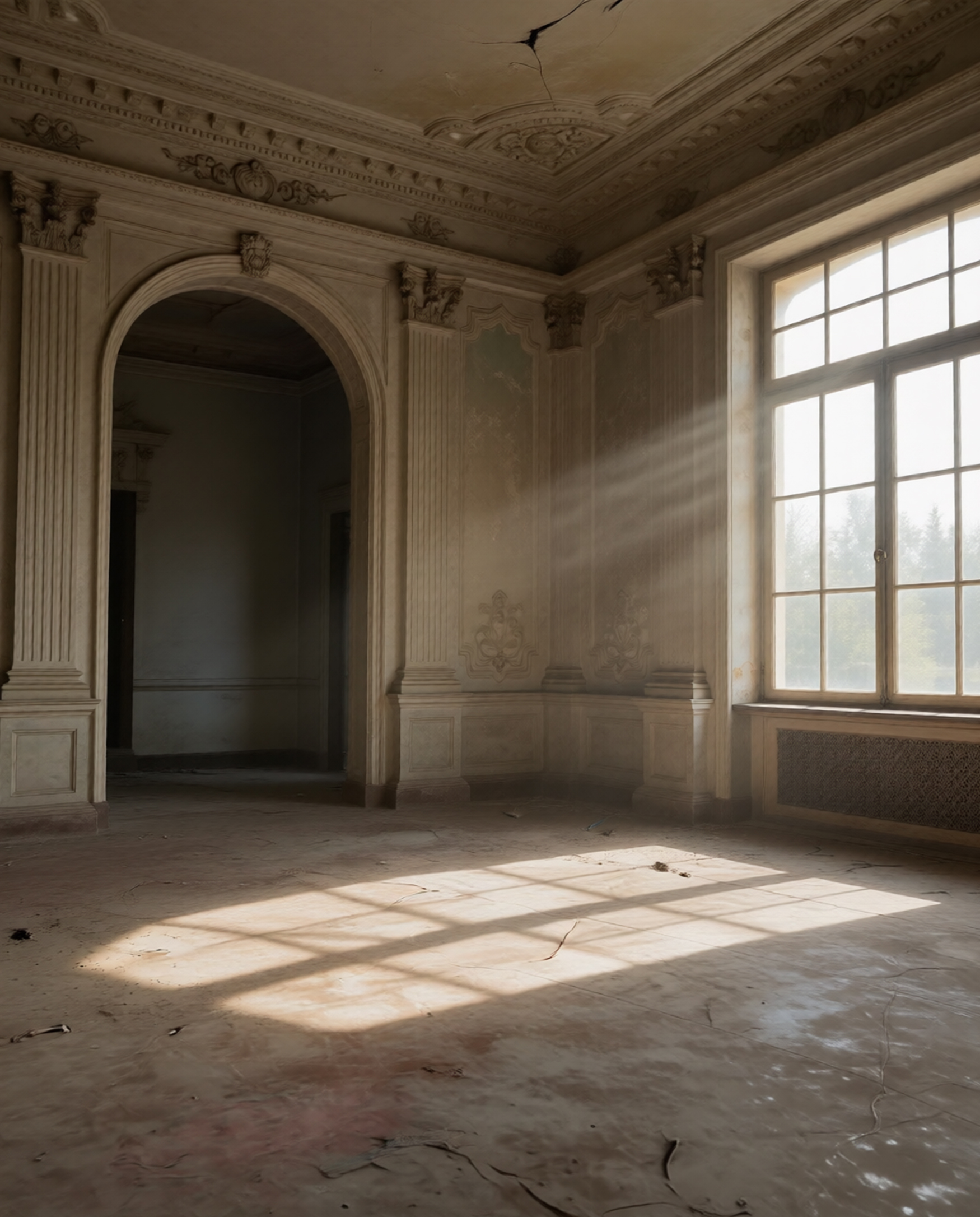 A visual study exploring silence, light, and suspended time within decaying architectural interiors.
